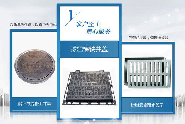 • 樹脂復(fù)合圓井蓋 樹脂復(fù)合方井蓋 樹脂復(fù)合雨水篦子 樹脂復(fù)合溝蓋板 樹脂復(fù)合電纜溝蓋板 樹脂復(fù)合樹池篦子及植草井 球墨鑄鐵圓井蓋 球墨鑄鐵方井蓋 球墨鑄鐵篦子及溝蓋板 不銹鋼井蓋及蓋板 PE檢查井系列 波紋管及中空壁纏繞管系列 玻璃鋼格柵系列 玻璃鋼標(biāo)志樁 化糞池 球墨鑄鐵復(fù)合井蓋 樹脂排水溝